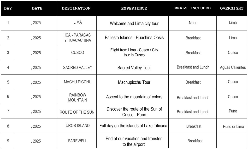 The time has come that we must return home! Today you will leave Puno or if your flight is very early, you will spend the night in Lima so, depending on the departure time of your plane, our transporters will take you to the airport. Once you arrive at the airport, grateful for your trust and your visit in our country the program will conclude. You will arrive at the Lima airport where you can wait a few hours to board your flight to Mexico City.