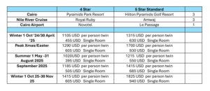 • Please note Internal Flights – Cairo/Aswan and Luxor/Cairo are NOT INCLUDED